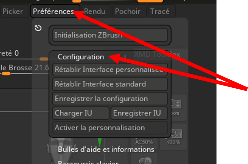 Si vous désirez vous débarrasser de votre brosse mise dans l’étagère du bas, il vous faudra toujours aller dans l’onglet « Préférence » qui est dans le Menu puis « Configuration » et « Activer la personnalisation ».