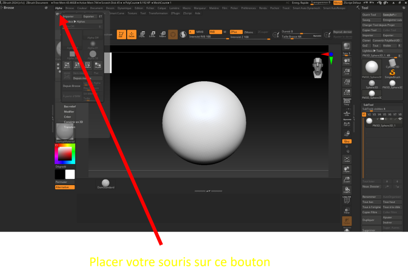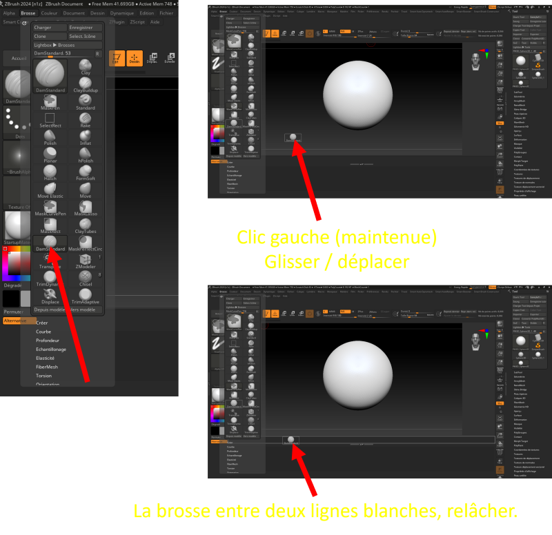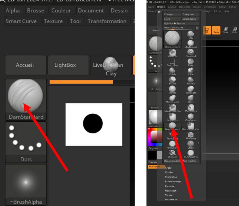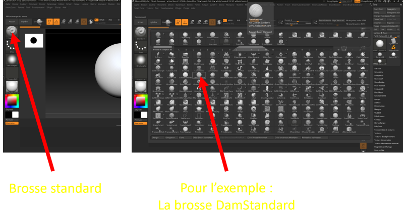 Comme dit précédemment, dans l’onglet brosse qui se trouve dans le menu, vous pouvez voir la brosse DamStandard.