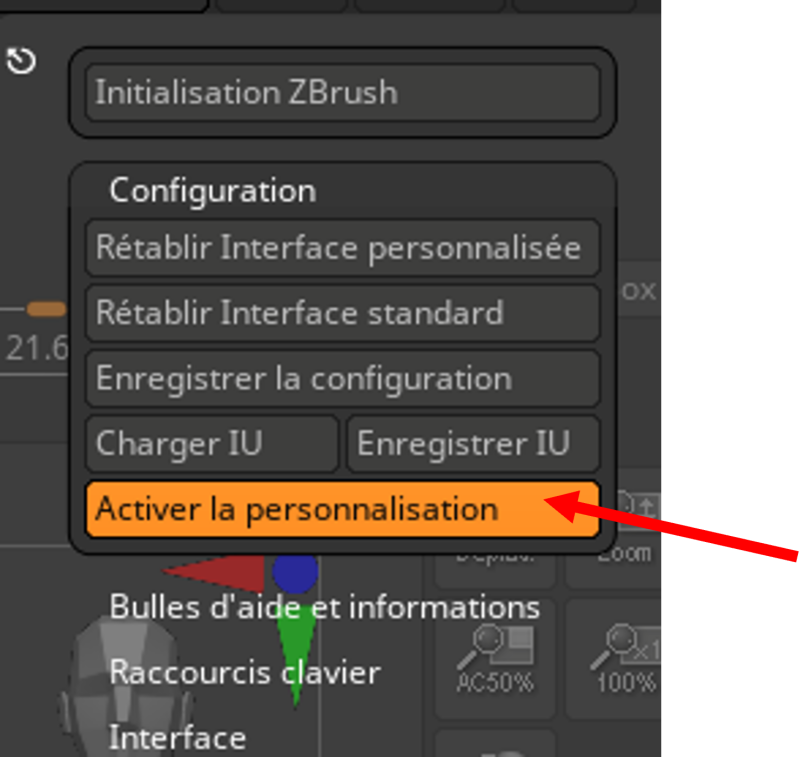 ATTENTION : Si vous n’enregistrez pas vos modifications d’interface, lorsque vous quitterez Zbrush, rien ne sera enregistré et lors de sa réouverture, aucune modification n’aura été prise en compte.